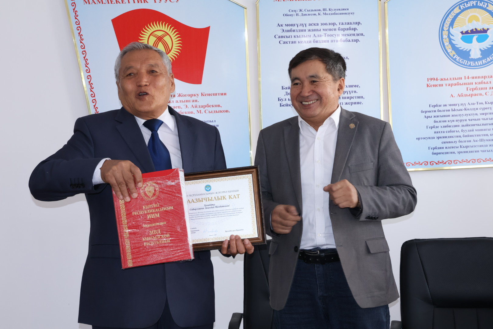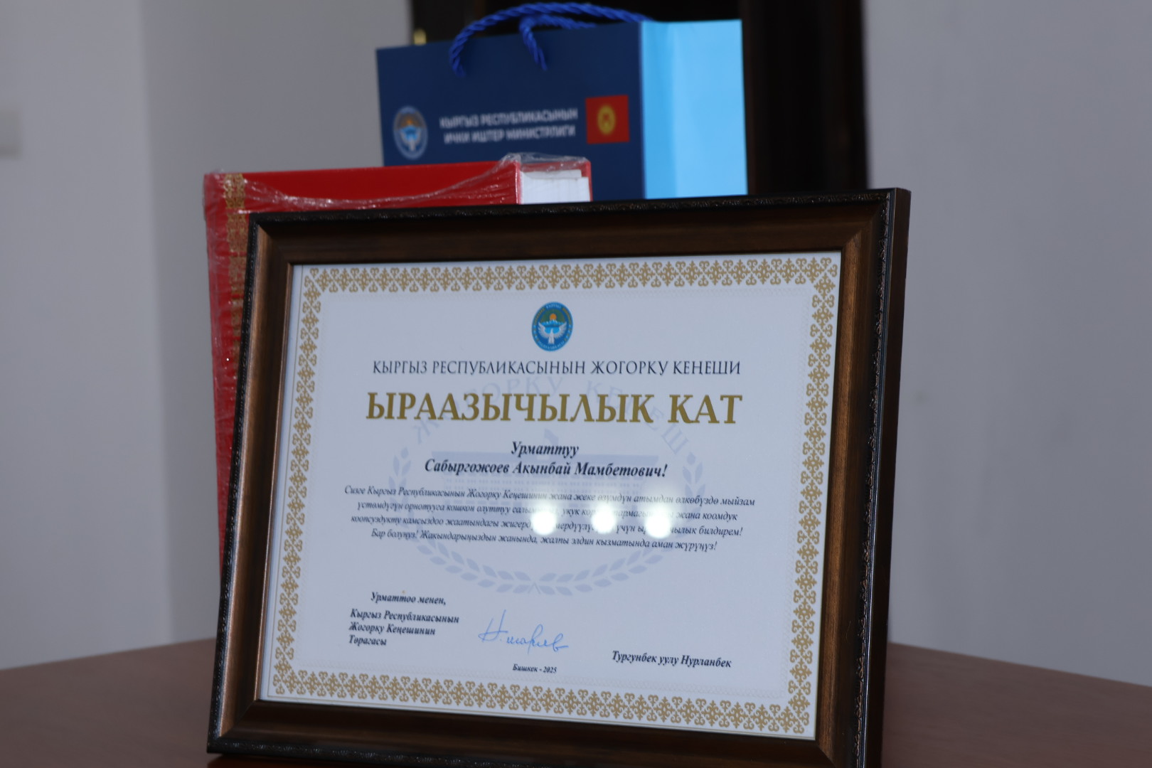 2026-жылдын 14-январында коомдук ишмердүүлүктөгү активдүүлүгү жана өсүп келе жаткан муунду тарбиялоого кошкон зор салымы үчүн Кыргыз Республикасынын Жогорку Кеңешинин Ыраазычылык каты менен Жайыл районунун Күзөт бөлүмүнүн Ардагерлер кеңешинин төрагасы Сабыргожоев Акынбай Мамбетович сыйланды. Салтанаттуу иш-чара Кыргыз Республикасынын Ички иштер министрлигинин тутумундагы ардагерлер уюмдарынын жетекчилеринин жана өкүлдөрүнүн катышуусунда өттү. Салтанатка Кыргыз Республикасынын ИИМдин Ардагерлер кеңешинин төрагасы Бакыт Сейитов, Кыргыз Республикасынын ИИМдин Жашы жете электердин иштери боюнча инспекциясынын башчысы, милициянын полковниги Нуржан Адылова, Күзөт кызматынын Ардагерлер кеңешинин төрагасы Мелс Белеков, ошондой эле ардагерлер уюмдарынын жана ИИМдин түзүмдүк бөлүмдөрүнүн өкүлдөрү катышышты. Иш-чаранын жүрүшүндө Акынбай Мамбетович көп жылдар бою коомдук жашоого активдүү катышып келгени, жаштарды патриоттук духта тарбиялоо боюнча системалуу иш алып барганы, ошондой эле жаш кызматкерлерге жана өсүп келе жаткан муунга кесиптик жана турмуштук тажрыйбасын бөлүшүп келгени белгиленди. Жолугушуунун катышуучулары ардагерлер уюмдарынын муундардын ортосундагы мурастуулукту чыңдоодогу, жаштардын жарандык жоопкерчилигин жана мыйзамга болгон урмат-сыйын калыптандыруудагы маанилүү ролун өзгөчө белгилешти. ИИМдин Күзөт кызматынын Басма сөз кызматы